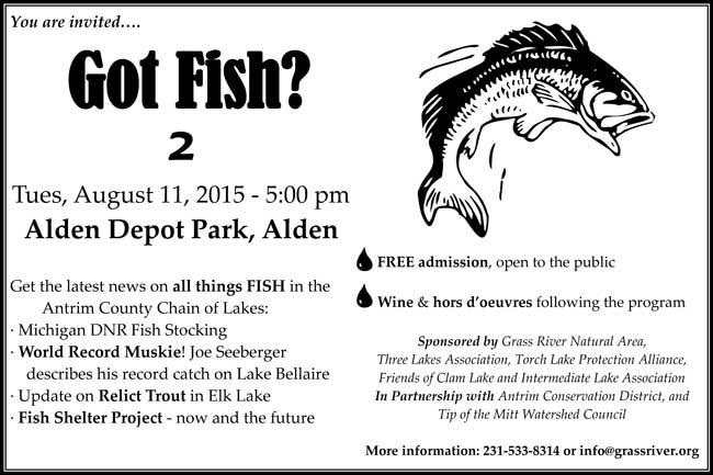 Join us on Tuesday, August 11, at 5:00 at the Alden Depot Park to hear the latest news on all things FISH in the Antrim County Chain of Lakes: